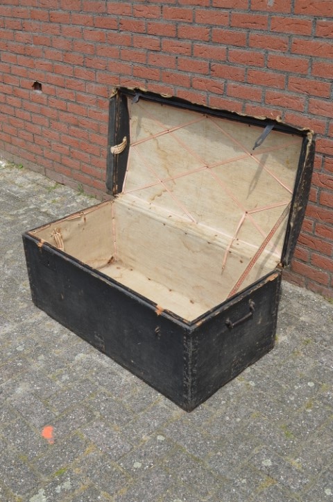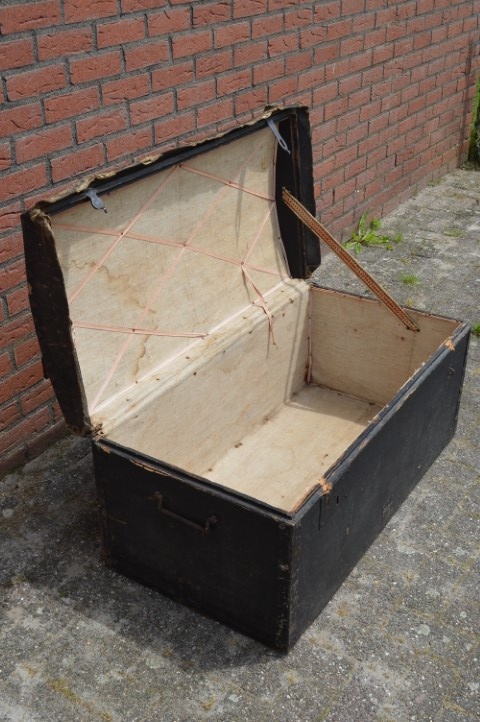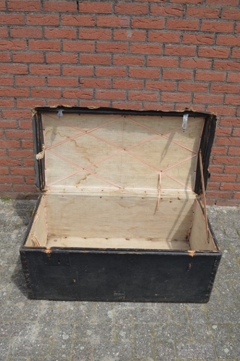Deze grote en stevige zwart geschilderde oude opbergkist volledig bekleed met oud linnen is ideaal voor uzelf en voor de kinderen om veilig en in stijl speelgoed, dekens, kussens of andere spullen op te bergen. De oude bruidskist heeft ooit gediend om de kleding van de bruid naar het huis van de bruidegom te vervoeren en daarna te dienen als hutkoffer Leuk voor in de woonkamer, slaapkamer of kinderkamer als sfeervolle decoratie en praktische opbergmogelijkheid.