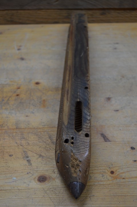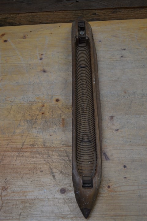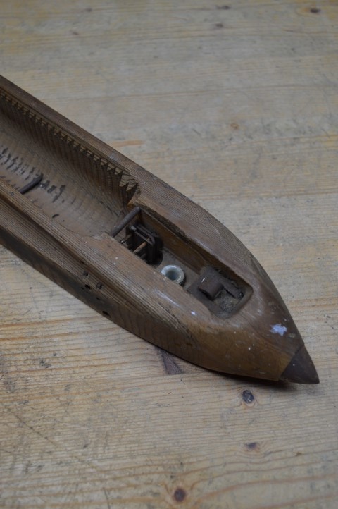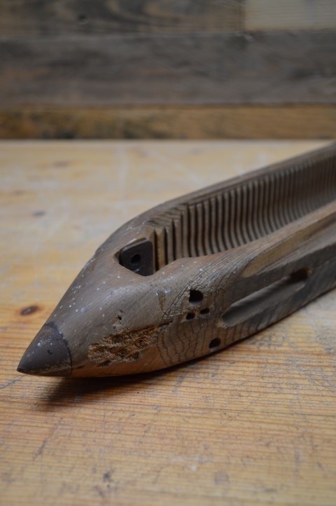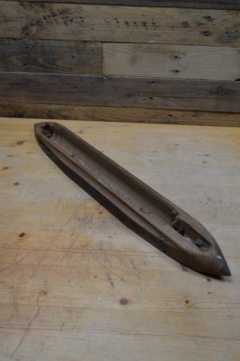 Antieke houten schietspoel van een ouderwets weefgetouw. Vroeger werd hiermee het inslaggaren aan het weefsel toegevoegd, maar tegenwoordig zijn deze mooie onderdelen vooral als decoratie in huis te zien.