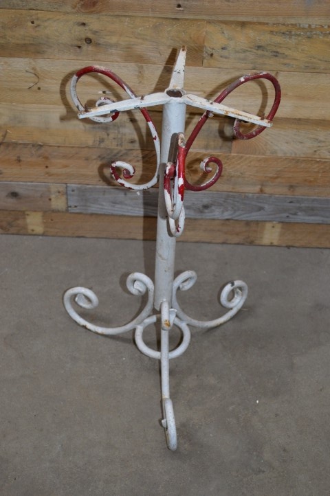 Sierlijke antieke metalen tafelpoot zonder blad. Prachtig om een glazen of marmeren blad op te monteren. De poot is meerdere malen en in verschillende kleuren geverfd wat het geheel een mengelmoes aan kleuren geeft maar die aan het uiterlijk een vrolijke noot geeft.