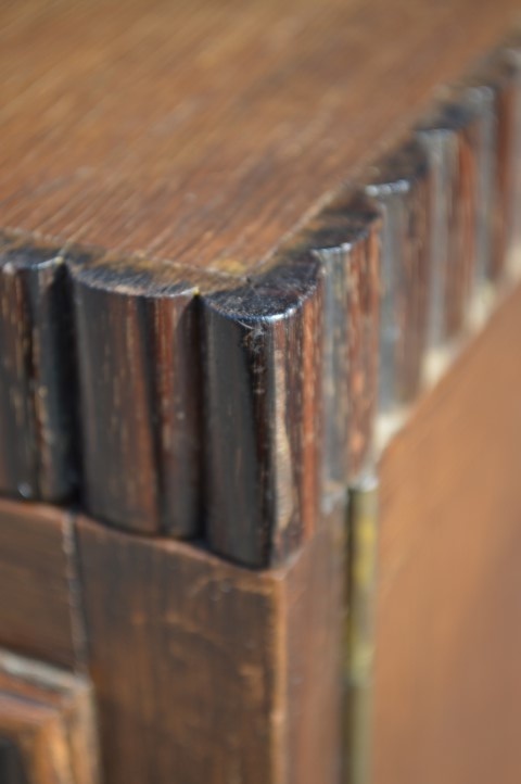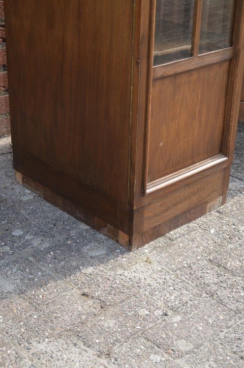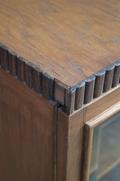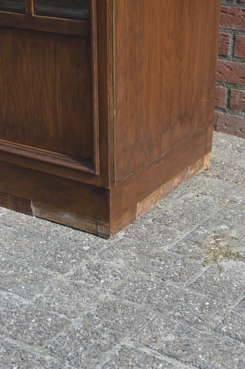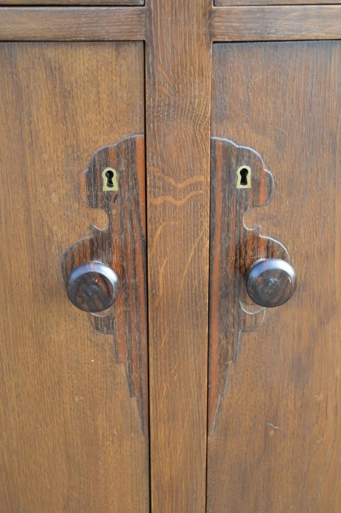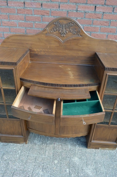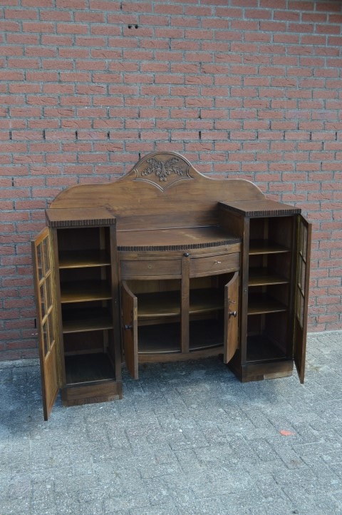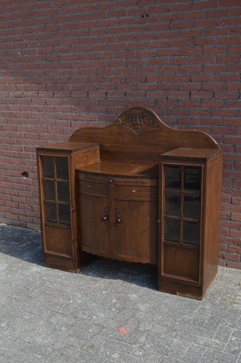 Prachtige antieke buffetkast gemaakt volgens de stijl van de Amsterdamse school, met donker hout mooie details en vier kastjes die veel schappen herbergen voor het veilig en stijlvol opbergen van al uw theeservies en keukengerei.