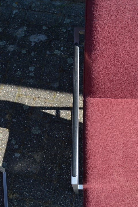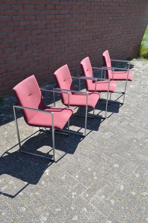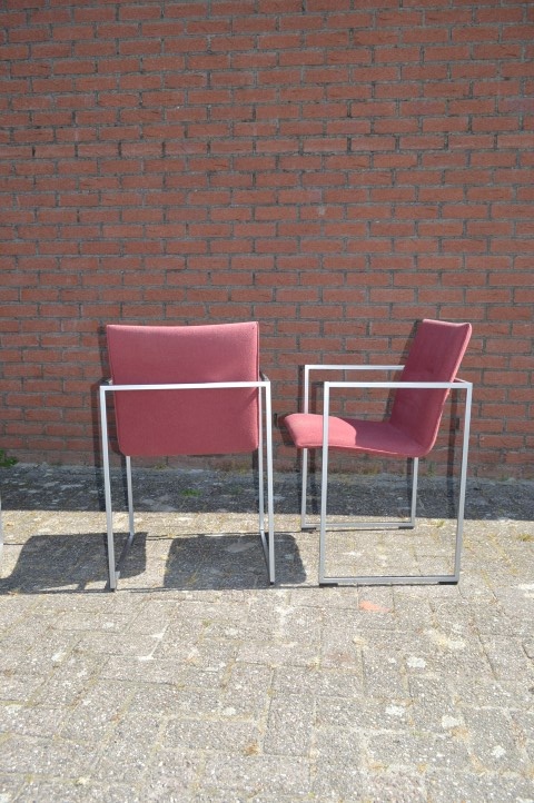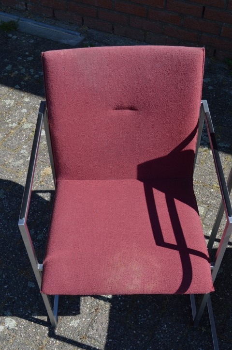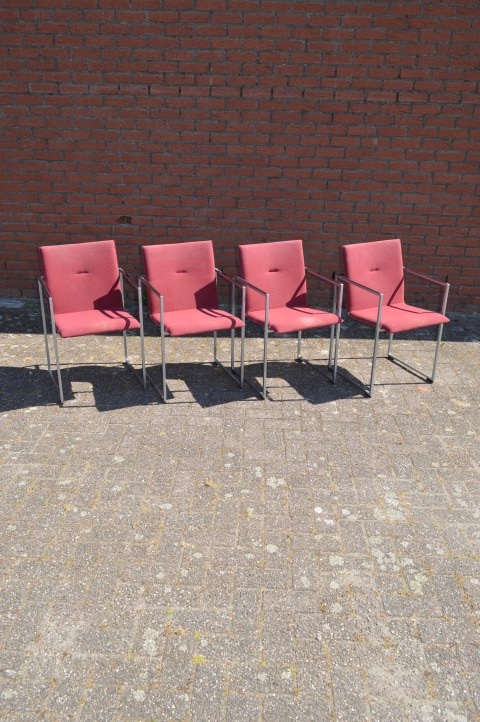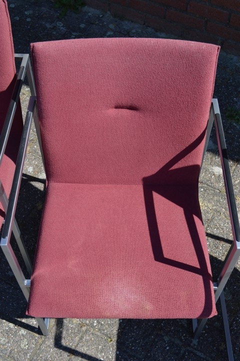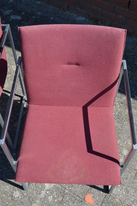 De stoelen verkeren in gebruikte staat en hebben lichte gebruikssporen en enkele vlekjes in de stoffering, passend bij hun leeftijd en gebruik. Dit doet niets af aan het zitcomfort en de uitstraling, maar geeft de set juist een authentiek karakter. Een mooie keuze voor liefhebbers van retro en designmeubilair.