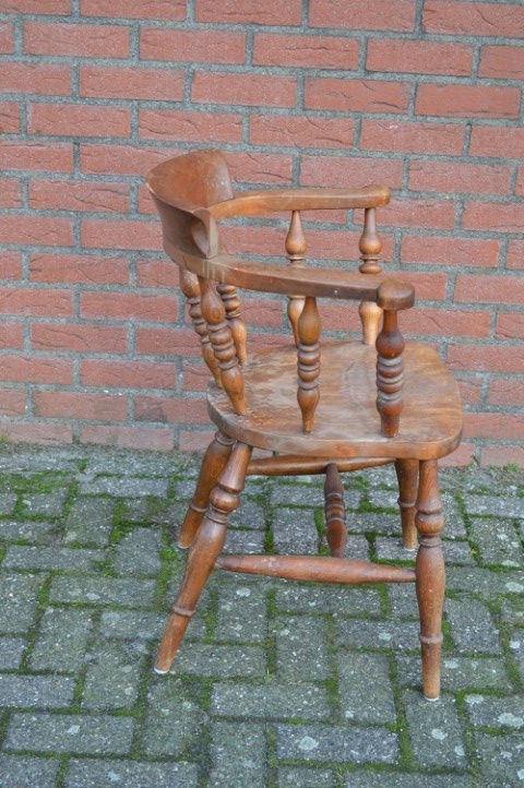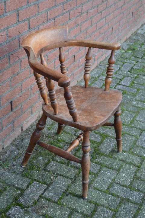 Prachtige Engelse Windsor armstoel uit het Victoriaanse tijdperk, genaamd "Captain Chair" of "Smoker Chair" gemaakt van gedraaid mahoniehout met vier poten die met elkaar verbonden zijn door een afstandhouder. Dit schitterende meubelstuk is oorspronkelijk gemaakt om te gebruiken als een bureaustoel maar vaak wordt hij tegenwoordig gezien bij een eettafel of als stoel extra. Het hout heeft in de loop der tijd een zeer mooie oude patina gekregen. De armstoel is gemaakt in Engeland, rond 1880.