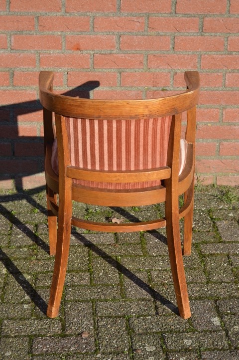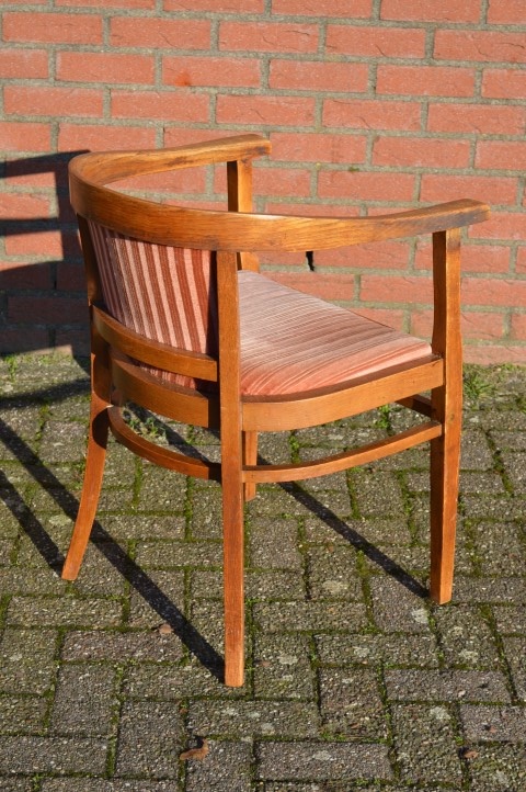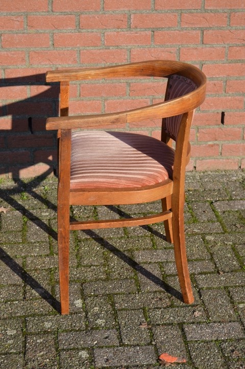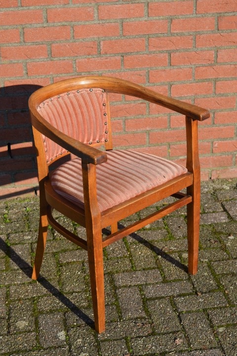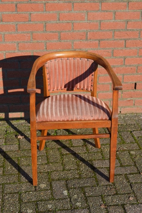 Mooi oud model eiken armstoel. Vanaf de jaren 30 werden deze hoge fauteuils gefabriceerd, voornamelijk voor de gegoede families. De rugleuning en zitting zijn bekleed met stof. Een armstoel als deze kan ook uitstekend gebruikt worden als keukenstoel of eetkamerstoel.