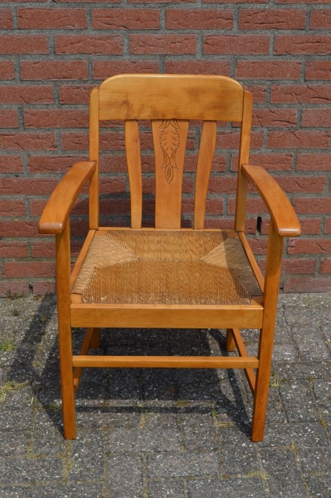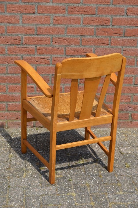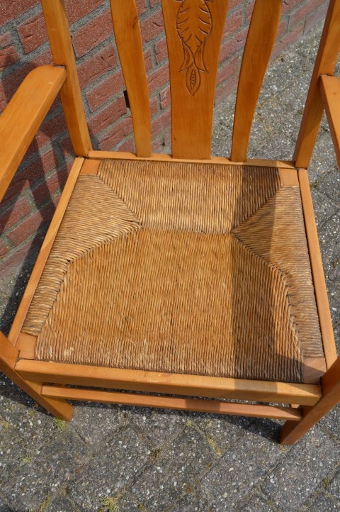 Schitterende vintage armstoel van beukenhout met biezen zitting. Een stoel uit de jaren 50 met hoog zitcomfort. Een brocante stoel zoals alleen door vaklieden gemaakt kon worden en daardoor, naast gewoon mooi te zijn, nog steeds zeer goed bruikbaar is.