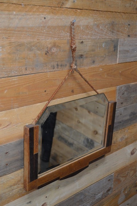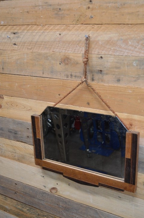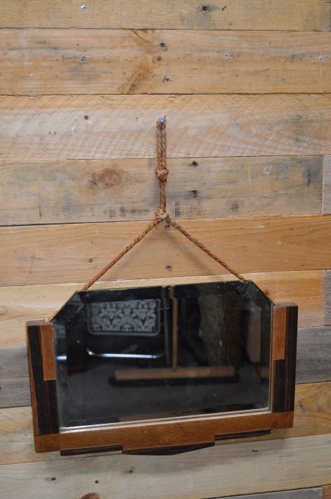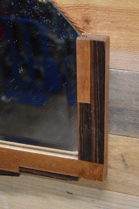 Art Deco facet geslepen spiegel gezet in een stevige driekwarts lijst van massief eiken en afgewerkt met strookjes palissander. Ideaal als wandspiegeltje of decoratief element in huis. In de Art Deco tijd, tussen 1900 en 1940 werden dit soort spiegels vaak opgehangen om de slaapkamer of hal een wat luxere uitstraling te geven. Het is een zeer ouderwets model spiegel die wonderbaarlijk goed past in zeer modern ingerichte woningen.