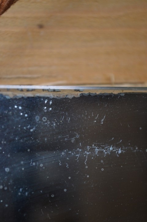 De spiegel heeft lang in een hal gehangen en heeft daardoor gebruikssporen opgelopen zoals kleine plekjes weer in de zilverlaag .