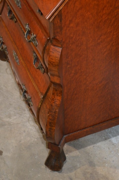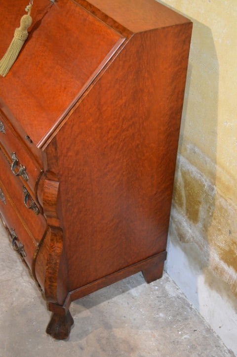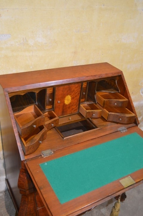Deze barok klepsecretaire is uitgevoerd in warm fineer en heeft een klassieke uitstraling. Het meubel beschikt over een uitklapbaar schrijfblad dat bekleed is met groen leer. Achter de klep bevinden zich diverse kleine lades en vakjes voor het opbergen van documenten en kantoorbenodigdheden.