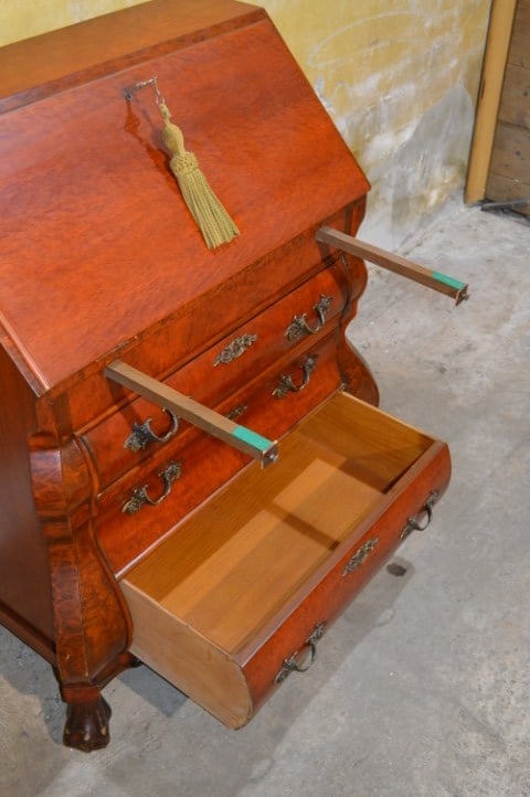Aan de onderzijde heeft de secretaire drie ruime lades, voorzien van sierlijk messing beslag. Dit maakt het meubel zowel functioneel als decoratief.