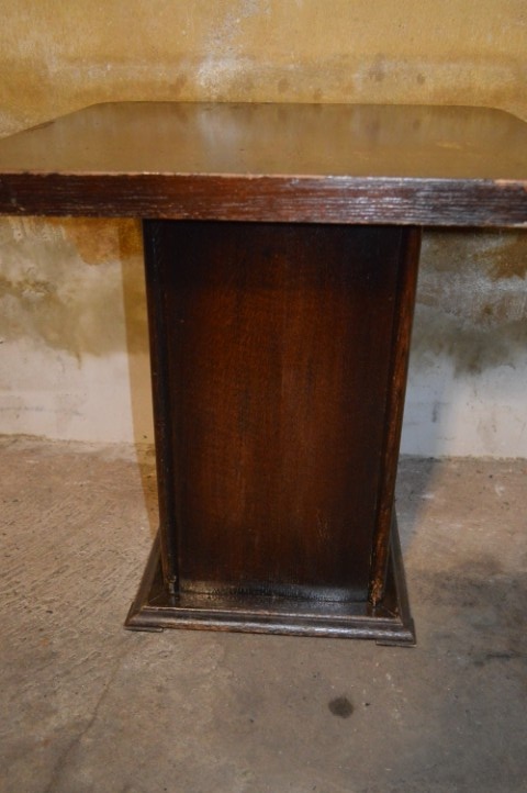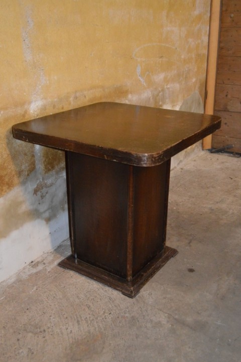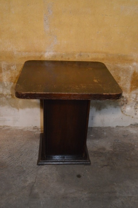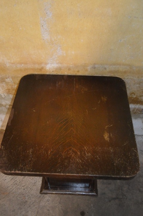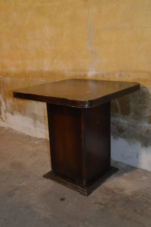 Dit vierkante vintage houten bijzettafeltje is afgewerkt met eiken fineer en uitgevoerd in Art Deco stijl.
