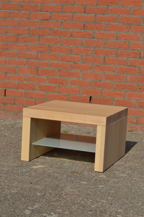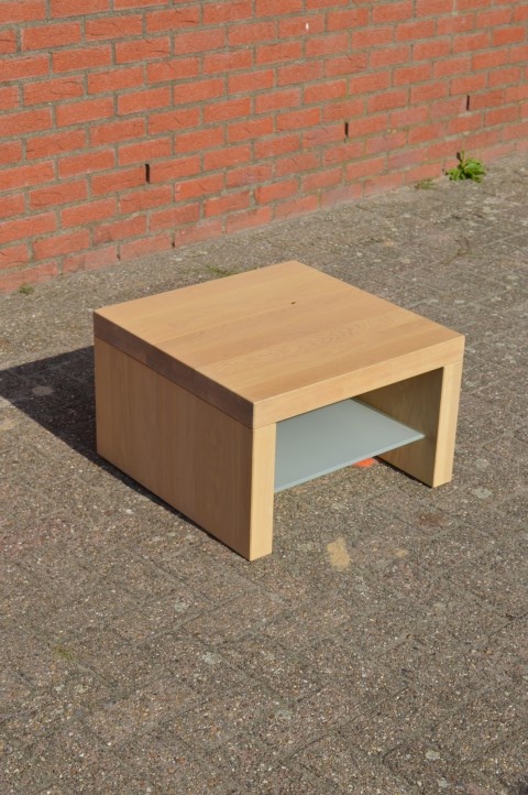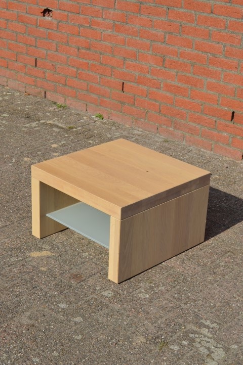 Mooi vierkant bijzettafeltje van eiken met whitewash kleur en glazen schap. Ideaal als plantentafel of om een decoratie op neer te zetten en staat prachtig in iedere woonkamer, maar kan bijvoorbeeld ook goed in de slaapkamer staan.