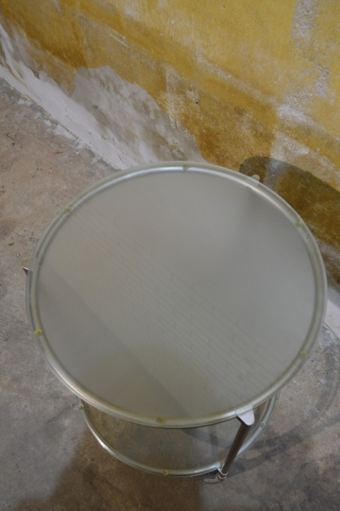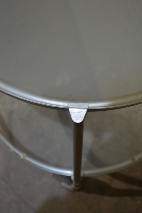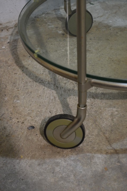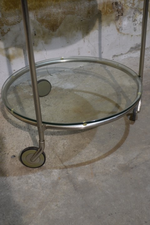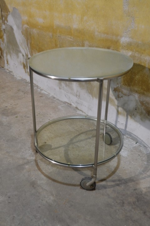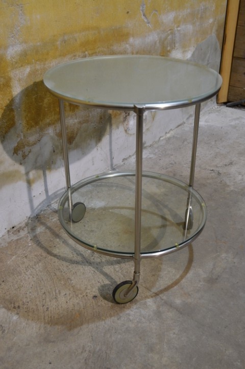 Deze IKEA STRIND bijzettafel is een design klassieker ontworpen door Ehlén Johansson. De tafel is uitgevoerd met een verchroomd metalen frame en twee ronde glasplaten, waarvan één matglas en één helder glas. Het meubel staat op wieltjes, waardoor het eenvoudig te verplaatsen is en multifunctioneel inzetbaar is als bijzettafel of serveertafel. De tafel vertoont gebruikssporen en slijtage aan de wieltjes, passend bij de leeftijd en het gebruik.