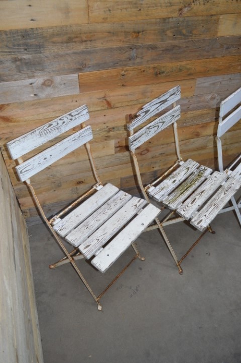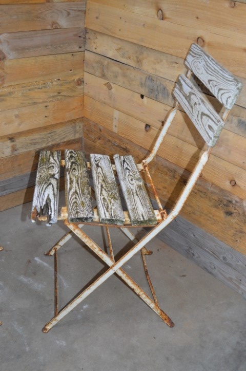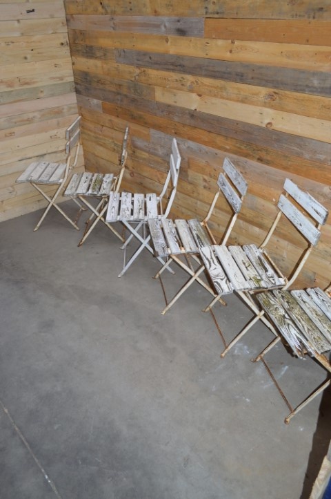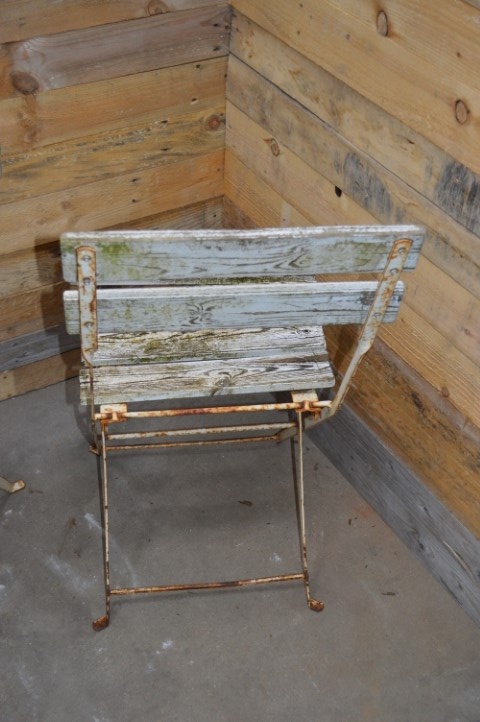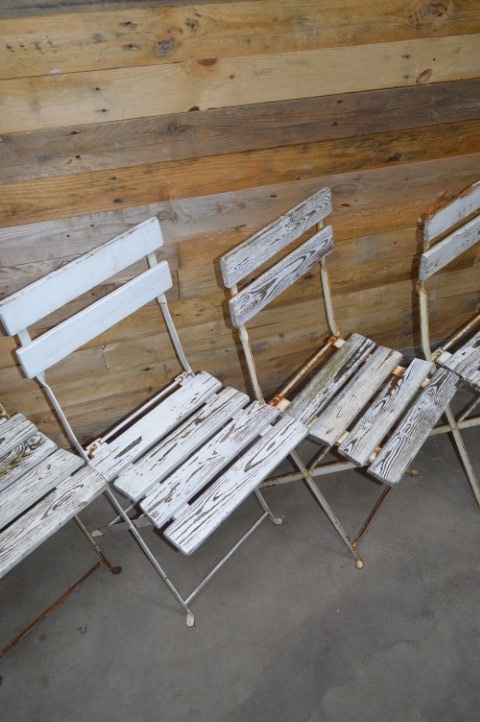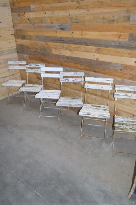 Set van 6 super leuke opklapbare bistrostoeltjes uit de vijftiger jaren. Deze 6 tuinstoeltjes hebben een behoorlijke opknapbeurt nodig daar zij door de tand des tijds nogal aangetast zijn. Het metaal is nog prima maar moet wel afgeschuurd en opnieuw geschilderd worden en het hout is matig tot slecht.