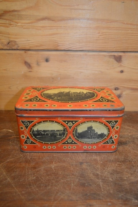 Een zoet stukje Arnhem in een charmant oranje blikje! Dit koektrommeltje uit de jaren 30 is een oranje blikje met ovaal medaillon waarin litho’s van de stad Arnhem zijn gedrukt. Destijds werden deze blikjes verkocht als souvenir in bakkerszaken en musea.