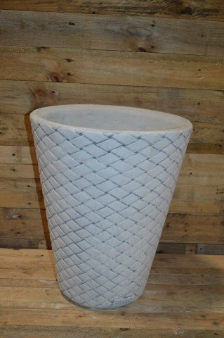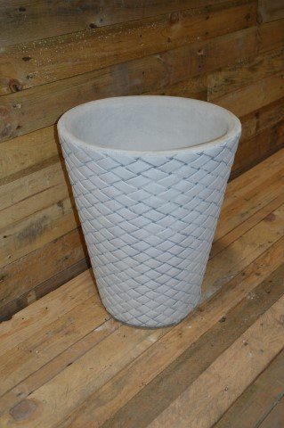 De ronde betonnen bloempot met vlechtwerk motief is robuust en decoratief. Geschikt voor een grote plant of kleine struik, maar ook prachtig als sierlijke vaas bij een ingang van een winkel, restaurant of hotel. Het vlechtwerk detail geeft de pot een charmante en tijdloze uitstraling, passend in iedere omgeving.