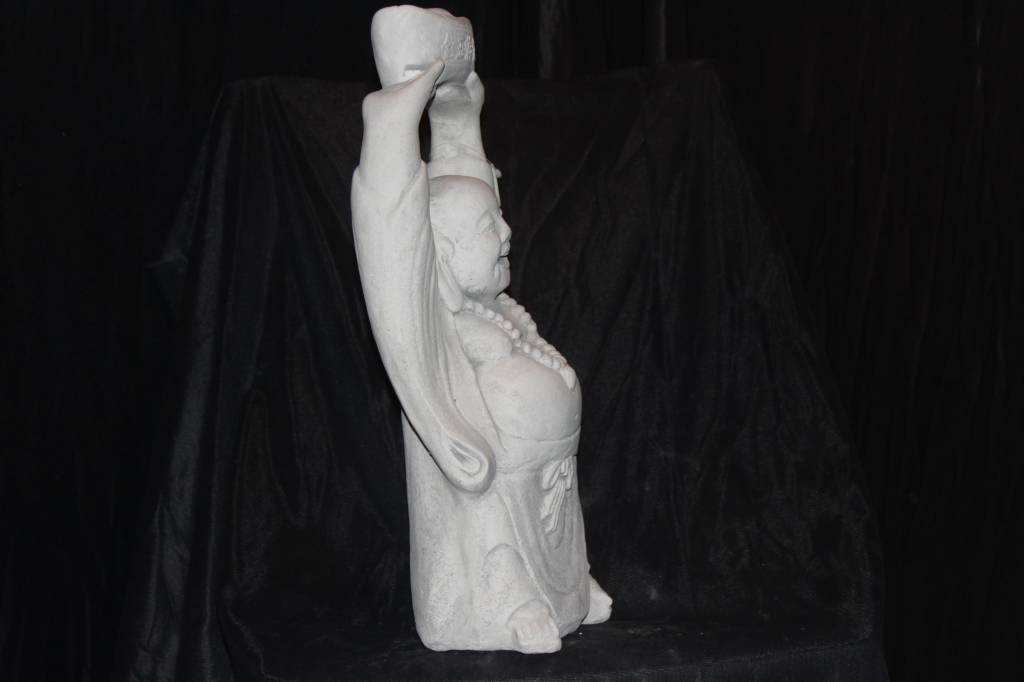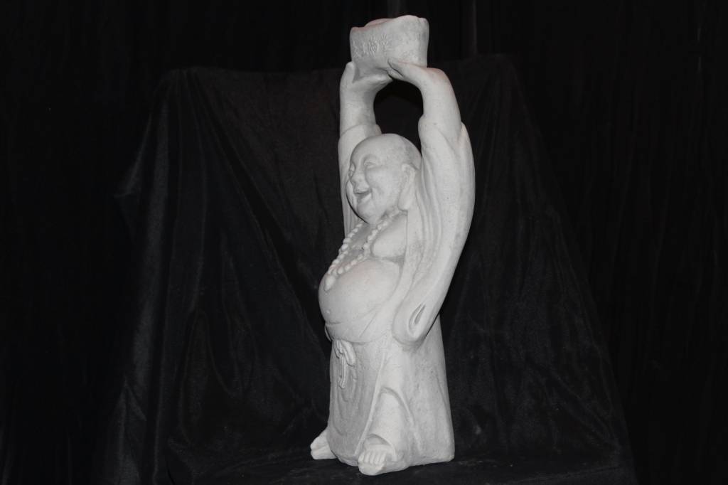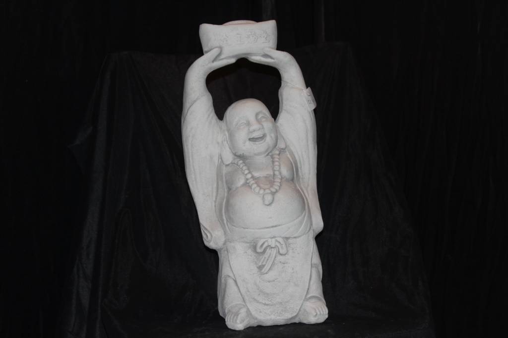 Dit betonnen beeld Boeddha lachend straalt vreugde en geluk uit. Met zijn handen triomfantelijk omhoog is deze Boeddha een symbool van overvloed en vrolijkheid. Het stevige beton maakt het beeld geschikt voor plaatsing in de tuin, op het terras of zelfs bij een vijver. Een tijdloos ornament dat warmte en positiviteit toevoegt aan iedere omgeving.