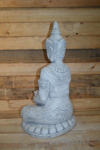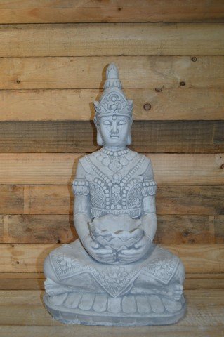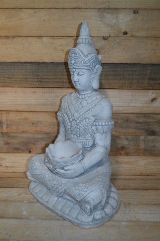 Dit betonnen Boeddha beeld uit het verre Oosten is ontworpen om een klein kaarsje in de lotusbloem te plaatsen, waardoor het zowel in de tuin als in huis een sfeervolle verlichting biedt. Het ornament is duurzaam en geschikt voor buitengebruik, terwijl het de rust en harmonie van de Oosterse stijl in uw interieur of tuin brengt. Een perfecte keuze voor liefhebbers van zen en Oosterse decoratie.