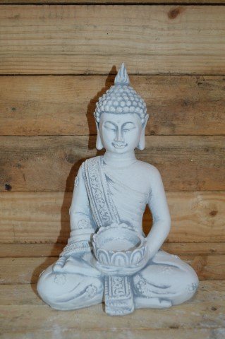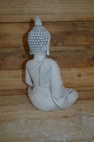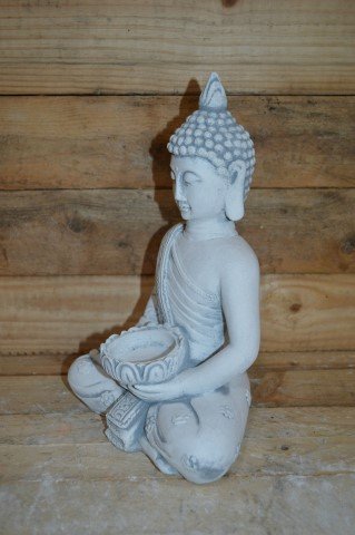Lange omschrijving: Dit betonnen Boeddha beeld zit in lotus houding en houdt een lotusbloem vast, waarin u een theelicht of kaars kunt plaatsen. Het ornament is geschikt voor binnen en buiten en brengt een oosterse, zen-achtige sfeer in uw tuin, op terras of in een meditatieve hoek in huis. Het duurzame beton garandeert een lange levensduur, terwijl de serene uitstraling van dit beeld rust en harmonie uitstraalt. Perfect voor liefhebbers van oosterse tuinarchitectuur of zen-decoratie.