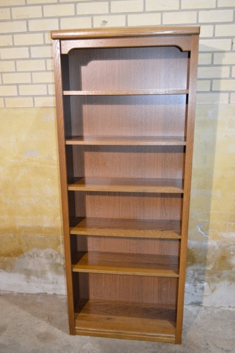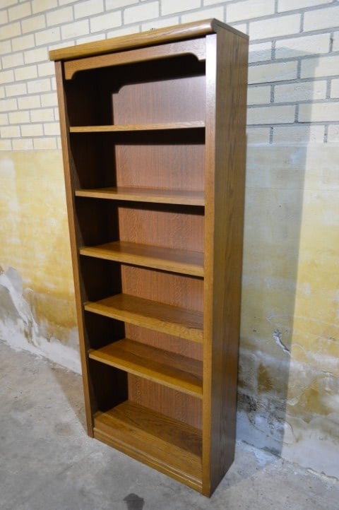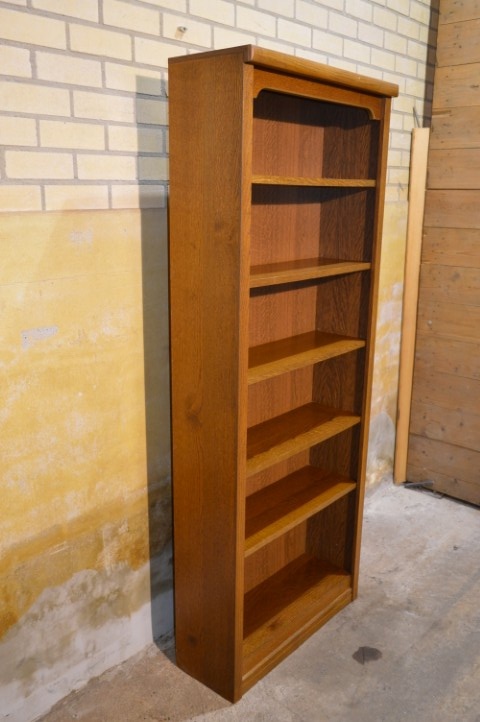 Deze donker eiken boekenkast met verstelbare schappen is een praktisch en tijdloos meubel. De schappen zijn naar wens in te delen, waardoor de kast geschikt is voor boeken, decoratie of andere spullen. De donkere houtkleur geeft een warme en klassieke uitstraling. De kast is tweedehands en heeft gebruikssporen, passend bij de leeftijd en het gebruik.