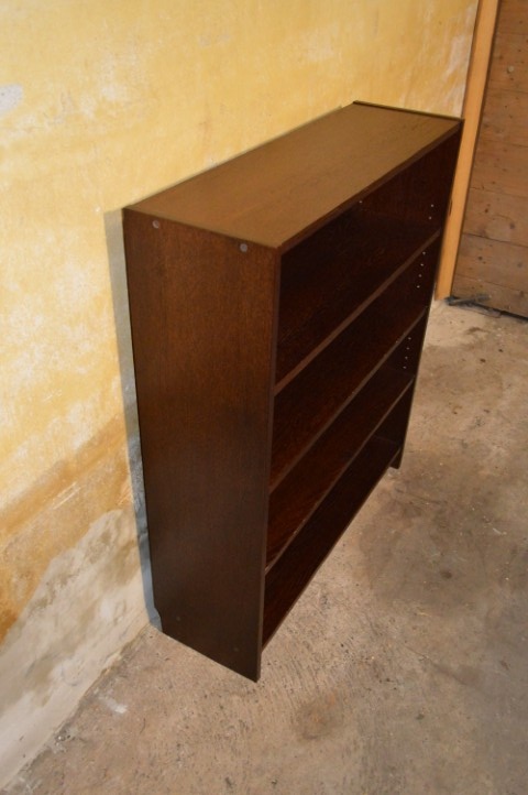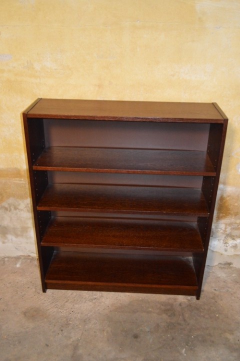 De kast is afkomstig uit de jaren 60 en uitgevoerd in een diep roodbruine houtkleur die zorgt voor een rustige en stijlvolle uitstraling. De boekenkast beschikt over drie legplanken die in hoogte verstelbaar zijn, waardoor hij geschikt is voor boeken, mappen of decoratieve objecten.