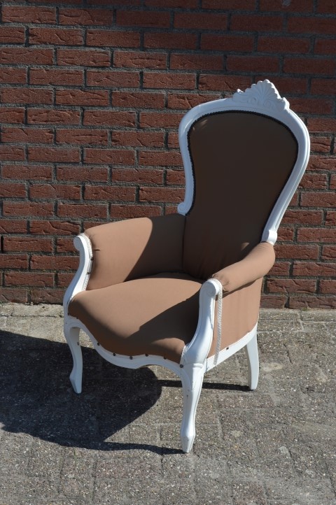 Deze opvallende brocante barok stoel bestaat uit wit geschilderd hout en een bruine stoffen bekleding die van deze prachtige barok fauteuil een echte blikvanger in huis maken.