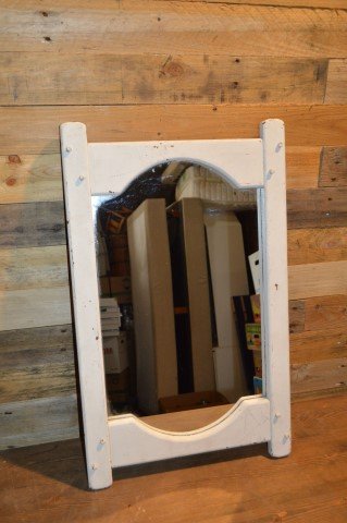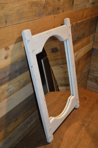 Prachtige brocante rechthoekige spiegel van massief eiken met witte lijst. Ideaal voor hal, slaapkamer of woonkamer. Verticale ophanging dankzij twee haakjes.