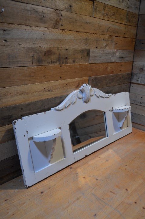 Mooi brocante spiegel met schapjes. Dit spiegeltje met facet geslepen glas met aan beide zijden een klein schapje was ooit het bovenstuk van een commode. Een kleine kuif bovenaan de lijst maakt van deze spiegel een kunstwerkje. Geleefd uiterlijk erg leuk voor aan de muur.