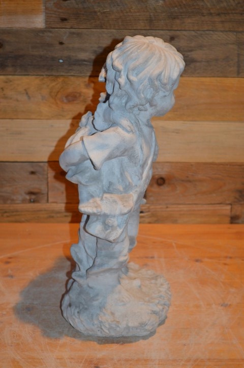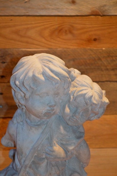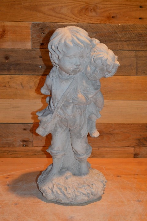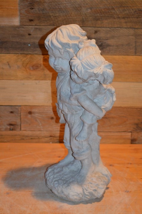 Broertje draagt zusje is een sfeervol betonnen kinderbeeld dat een liefdevol tafereel uitbeeldt: een jongetje dat zijn kleine zusje op de rug draagt. Dit charmante beeld straalt zorgzaamheid en speelsheid uit en past perfect in een tuin, op een balkon of bij een entree. Gemaakt van duurzaam gietsteen (beton), waardoor het bestand is tegen weer en wind. Een prachtige decoratie met een warm karakter.