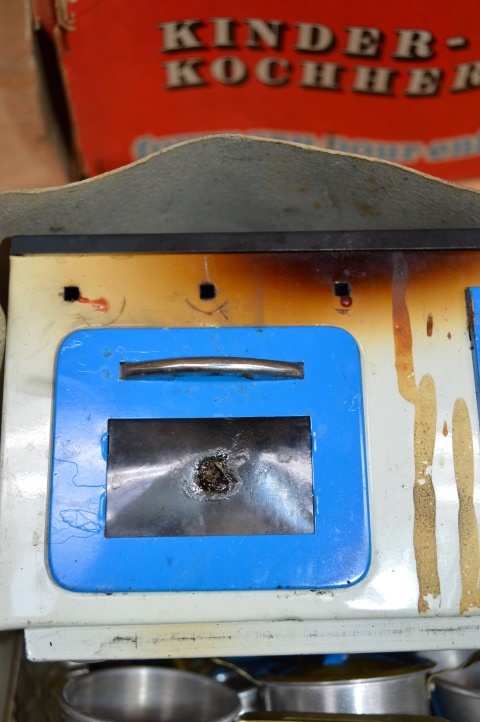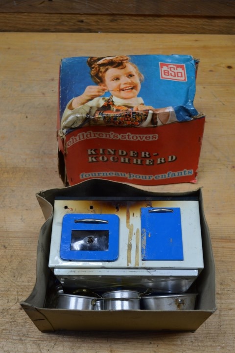 Omdat het een oude blikken keuken betreft zijn er uiteraard gebruikssporen aanwezig, zo heeft deze kinderkeuken in het verleden wat brandschade opgelopen, maar ondanks dat kan er met dit mooie speelgoed nog steeds erg goed gespeeld worden. Daarnaast is deze kleine keuken ook erg mooi voor mensen die bijvoorbeeld blikken speelgoed opknappen of verzamelen.