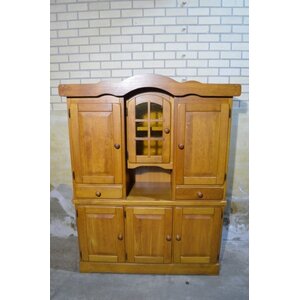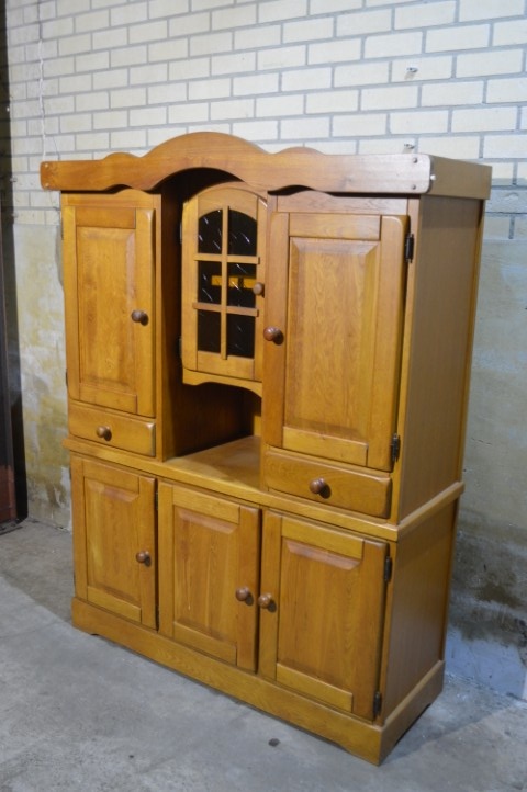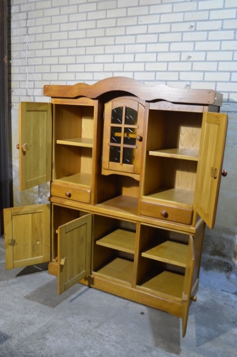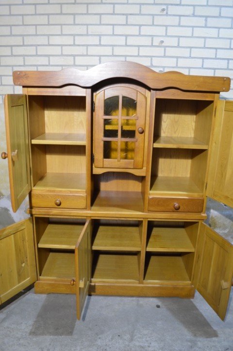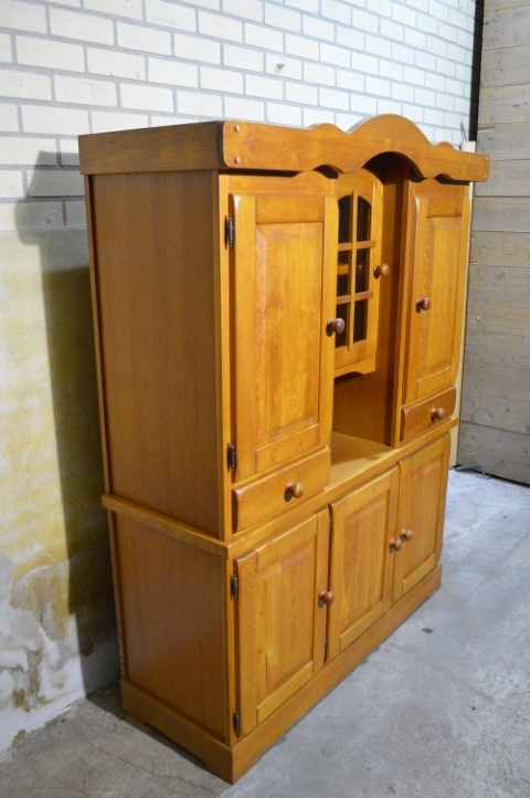 Deze blank eiken buffetkast is een 2-delig meubel met een praktische en overzichtelijke indeling. In het midden bevindt zich een vitrinekast met daaronder een open vak, ideaal voor het tonen van servies of decoratie.