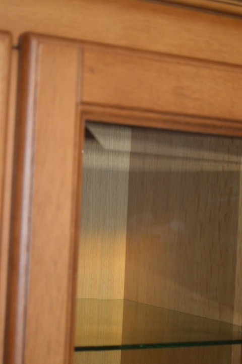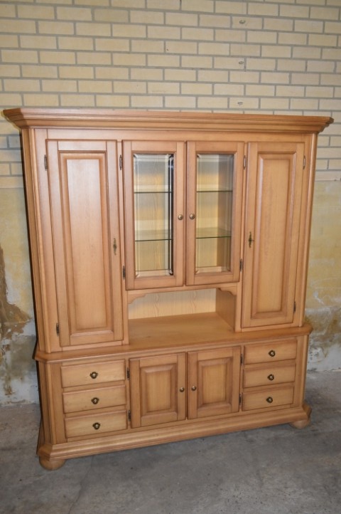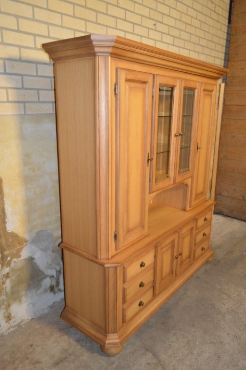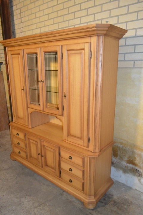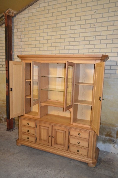 Deze robuuste blank eiken buffetkast met vitrine heeft een bijzondere en opvallende indeling die meteen de aandacht trekt. De bovenkast beschikt over een centraal vitrinegedeelte met facet geslepen glas en glazen schapjes, met daaronder een open middenvak. Aan weerszijden bevinden zich twee handige kastjes met deurtjes.