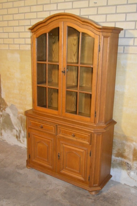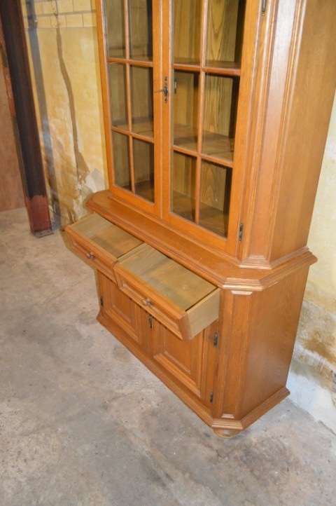 Charmante kleine grenen buffetkast met twee deuren met ramen in de bovenkast en een dichte onderkast. Tussen beide delen bevinden zich twee praktische lades, ideaal voor bestek, linnen of andere kleine spullen. Deze buffetkast is uitstekend geschikt als glazen- en servieskast, maar kan ook prima dienst doen als boekenkast of linnenkast.