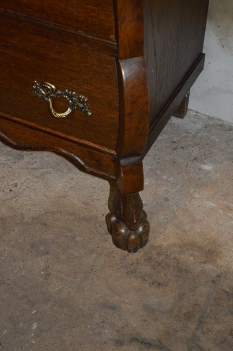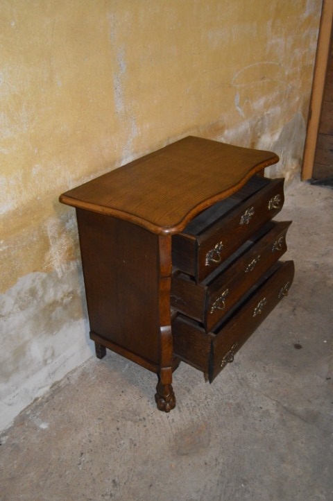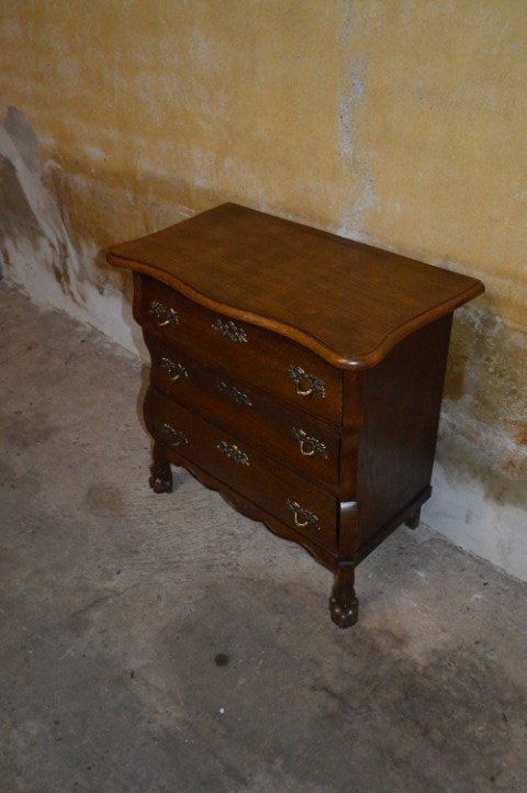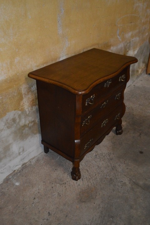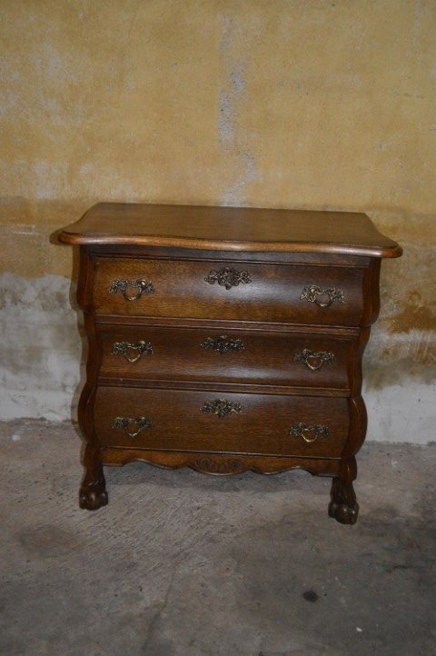 Het kastje heeft aan de voorzijde sierlijke leeuwenklauwpootjes en is voorzien van drie laden met mooi messing beslag en handgreepjes. Dankzij het compacte formaat is het ideaal als bijzetkastje, waarop bijvoorbeeld een grote vaas of een beeldje prachtig tot zijn recht komt.