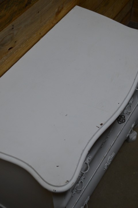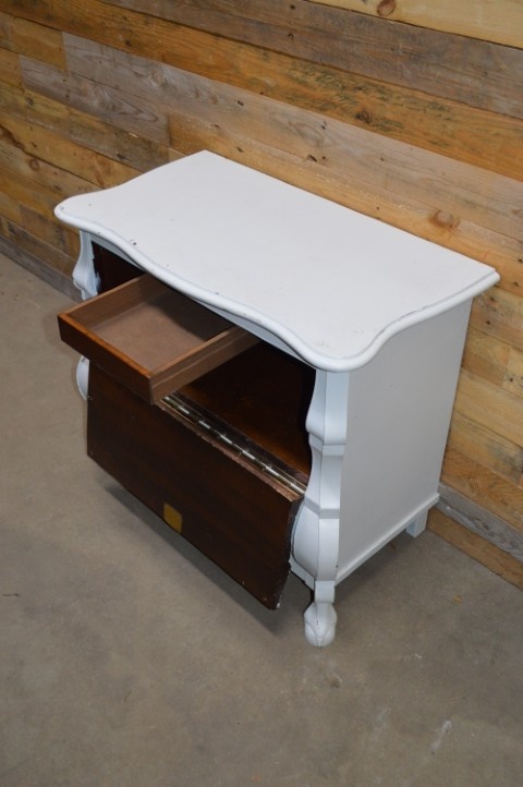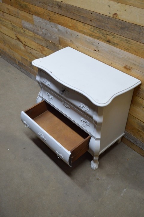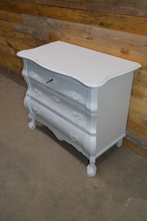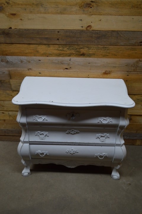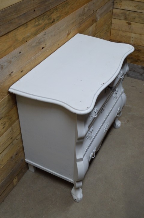 De vintage buikkast uit de tweede helft van de 20-ste eeuw heeft gebruikssporen en is wit geschilderd.