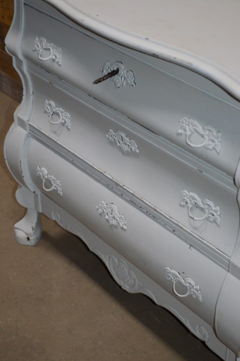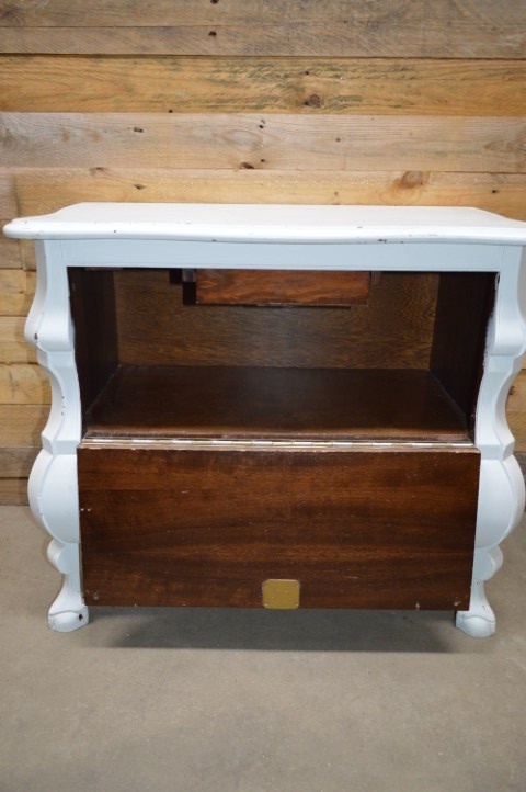 Dit buikkastje lijkt 3 lades te hebben maar achter het front van de bovenste lade zit een kastje met daarin een verstopte lade. Een prachtig klein dressoir dat uitstkend te gebruiken is al theekastje, juist vanwege die klep. Het leuke ladekastje kan natuurlijk ook gebruikt worden als tv kast of gewoon als bijzetkastje of commode.