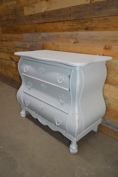 De lades van deze commode hebben messing handgrepen al is dat niet direct zichbaar omdat zij meegeschilderd zijn.