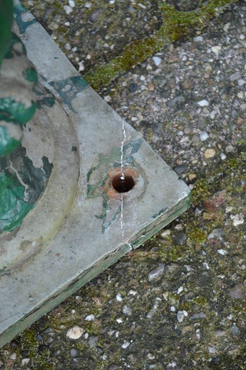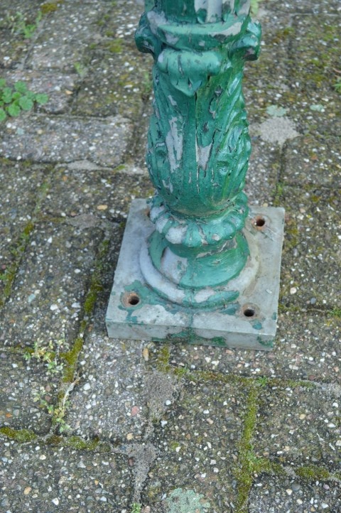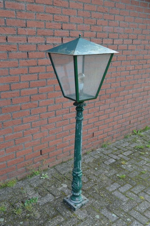 Het is een tweedehands tuinlamp die gebruikssporen heeft en een klein hoekje van de poot is afgebroken.