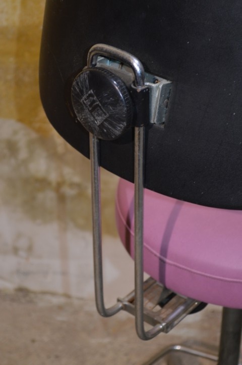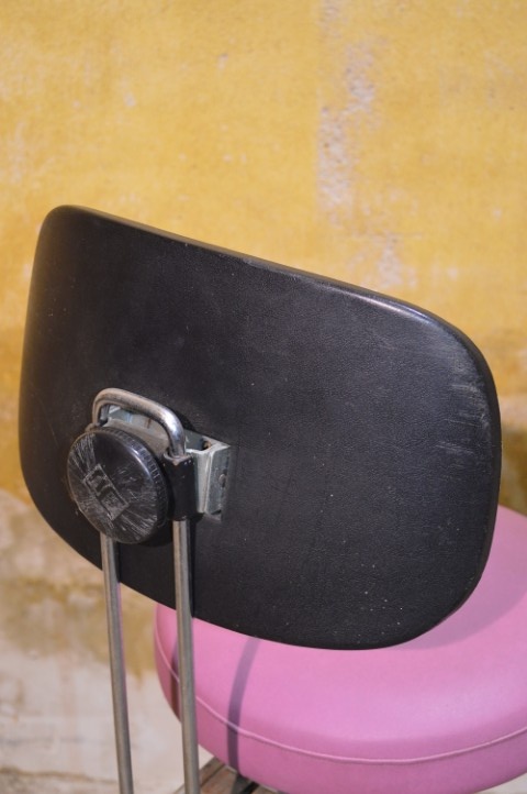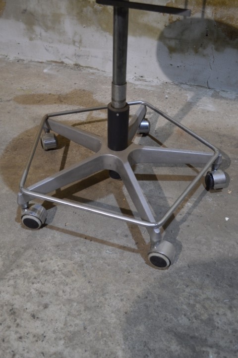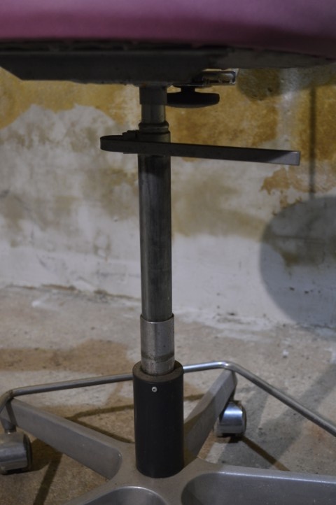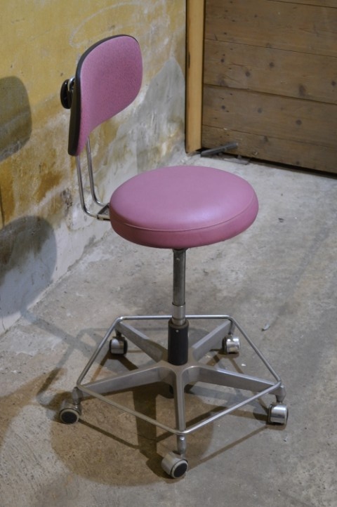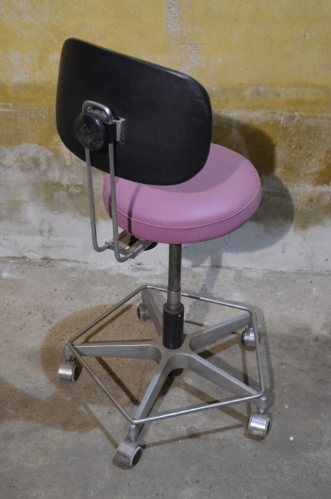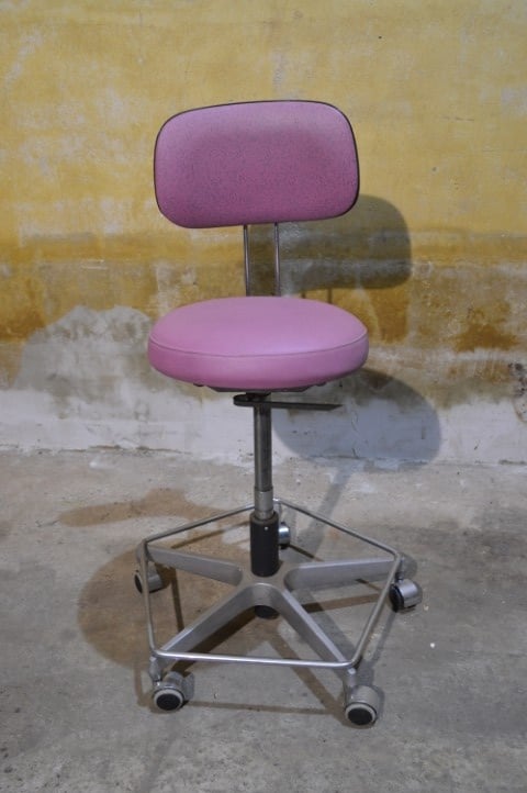 De stoel is tweedehands en vertoont gebruikssporen passend bij gebruik in een werkomgeving.