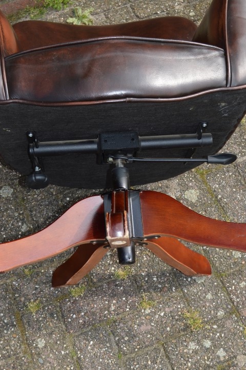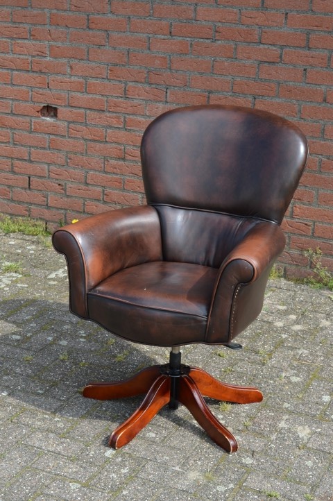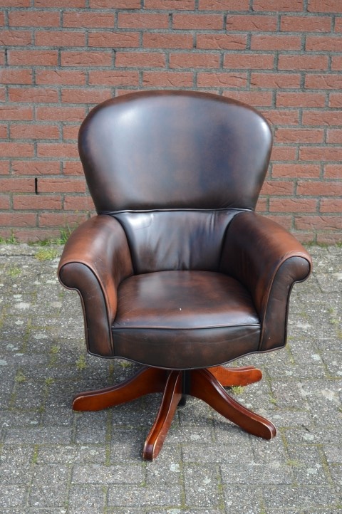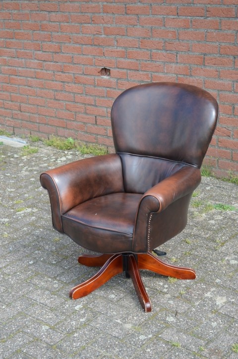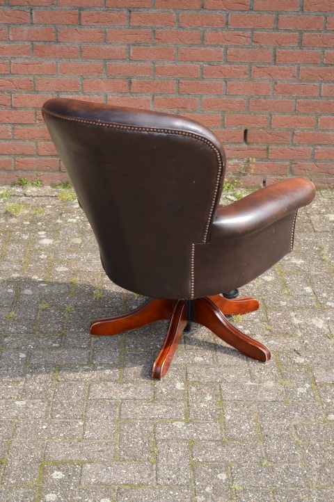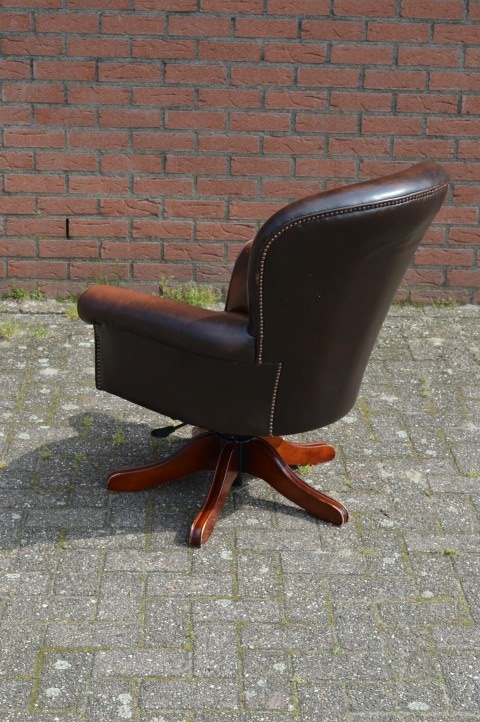 Bureaustoel "Admiral Brown." De stoel is uitgevoerd in mooi Engels bruin rundleder. Deze stoel combineert relaxcomfort met een klassieke uitstraling. De stoel is in hoogte verstelbaar en zowel in vaste als in zweefstand instelbaar. Dit is een authentieke, traditioneel vervaardigde stoel.