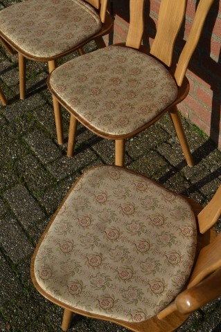 De houten frames zijn zeer stevig maar mochten de verbindingen los gaan, dan kun je ze zo weer lijmen. De bekleding heeft gebruiksslijtage maar zou gemakkelijk vervangen kunnen worden.