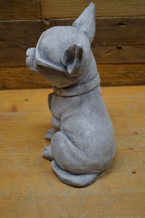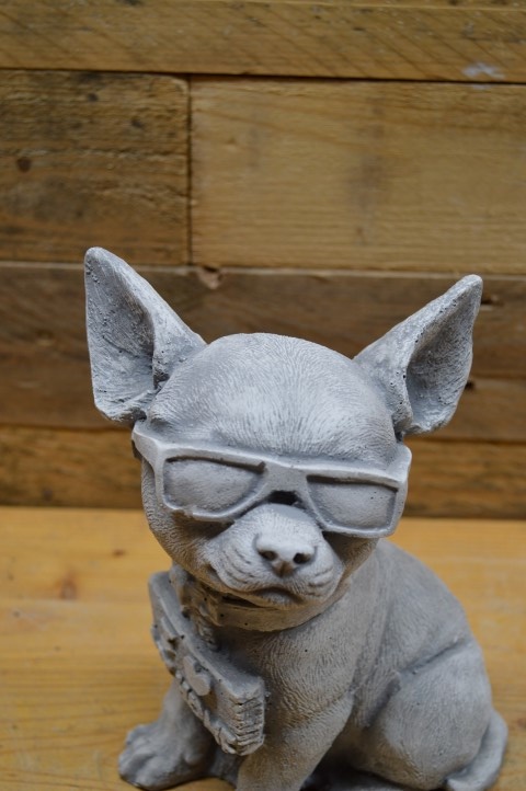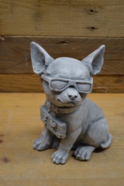 Deze betonnen beeld Chihuahua met zonnebril is een stoer en grappig decoratiebeeldje voor liefhebbers van kleine honden met karakter. De Chihuahua draagt een zonnebril en heeft een bordje om zijn nek, wat hem een ondeugende en opvallende uitstraling geeft. Dit ludieke betonnen beeld staat geweldig op een dressoir, in de vensterbank of op een ander plekje in huis. Ook buiten op een beschutte plek zorgt hij voor een glimlach.