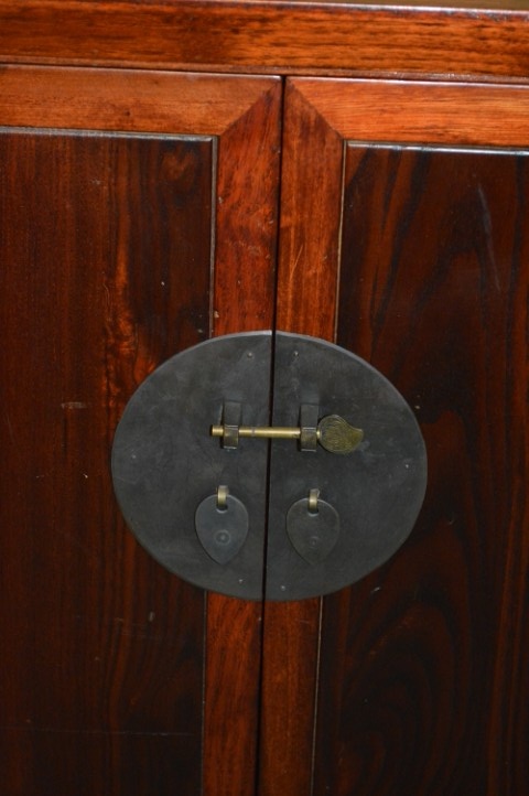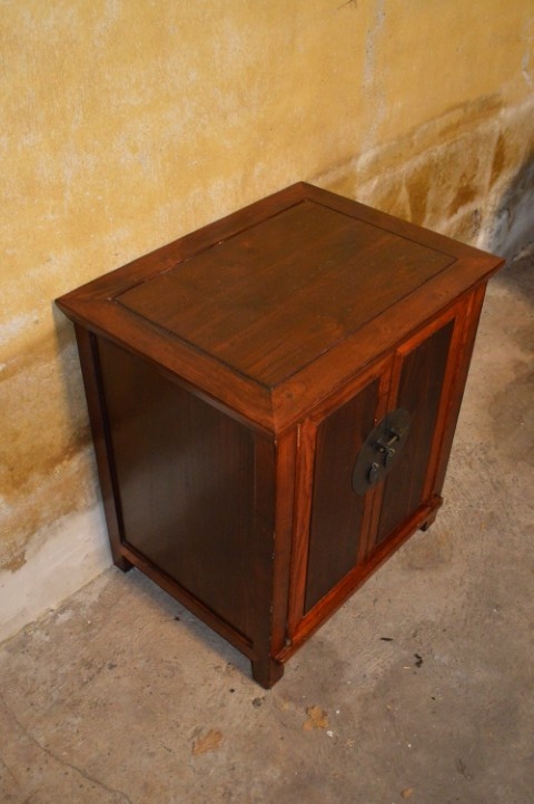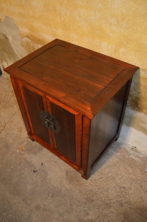 it kleine Chinese bijzetkastje heeft een klassieke vorm in een warme roodbruine en donkerbruine lak.