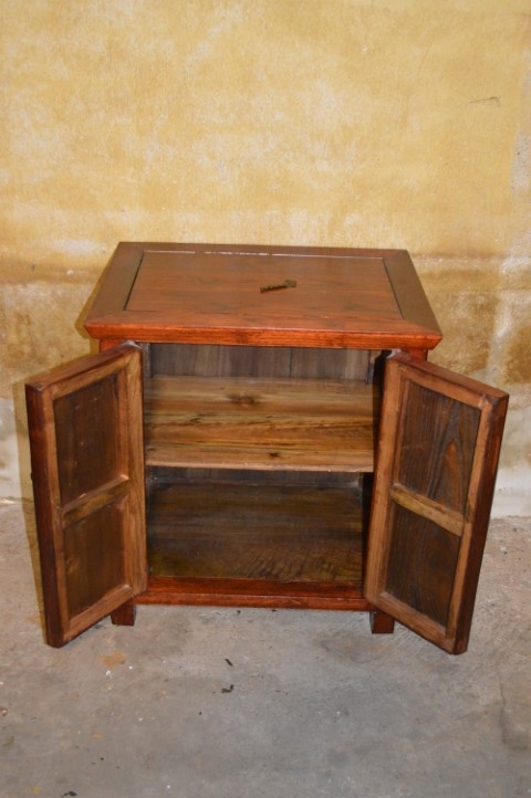 Het kastje is vrijstaand en voorzien van twee deuren met een metalen sluiting. Aan de binnenzijde bevindt zich een plank, ideaal voor het opbergen van kleinere spullen. Dankzij het compacte formaat is het kastje geschikt als bijzetkastje of opbergmeubel. Het verkeert in gebruikte staat met zichtbare gebruikssporen, passend bij de leeftijd en uitstraling.