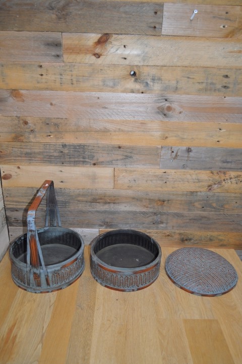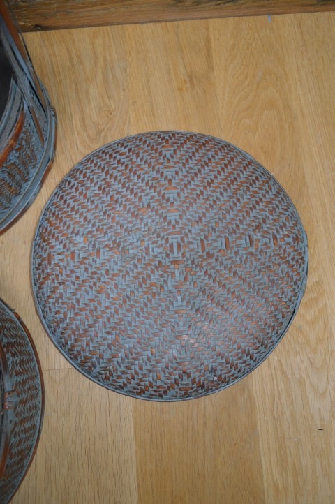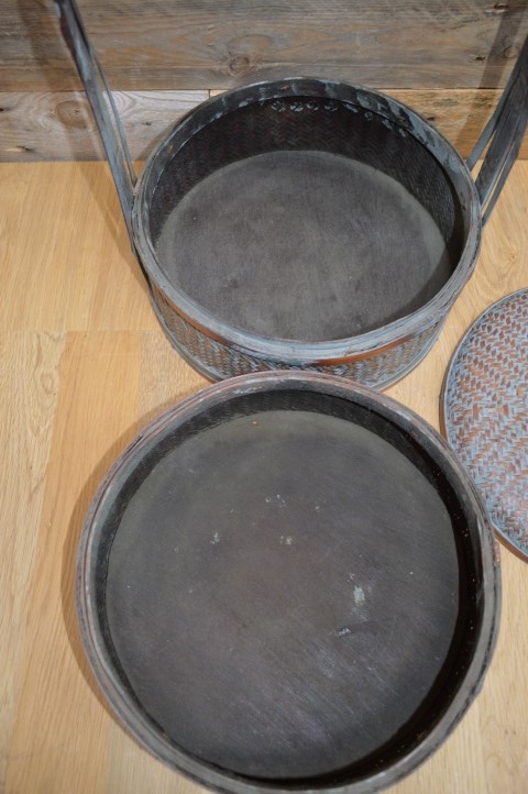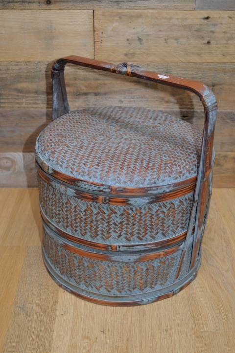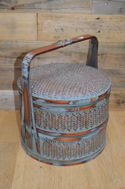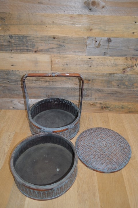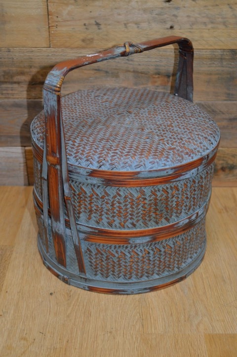 Chinese lunchdoos met twee lagen. De ronde bamboe ringen zijn bekleed met gevlochten gespleten bamboe. Tegenwoordig vaak gebruikt als juwelendoos of gewoon als vintage decoratie.