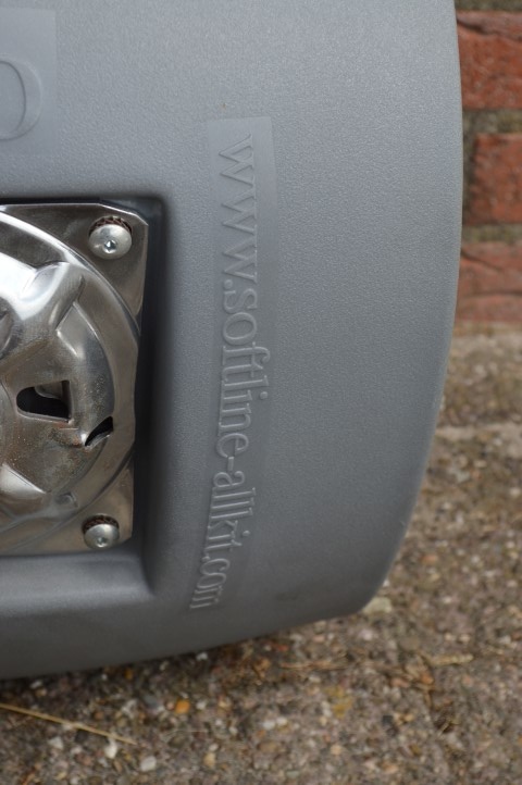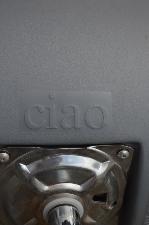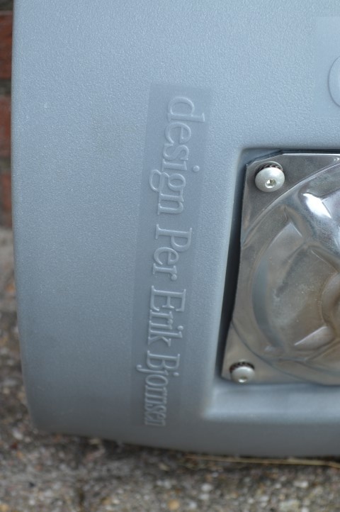 Aan de onderzijde van deze blauwe Ciao stoelen staan de naam van de ontwerper Per Erik Bjornsen, Ciao en de website www.softline-allkit.com gesigneerd.