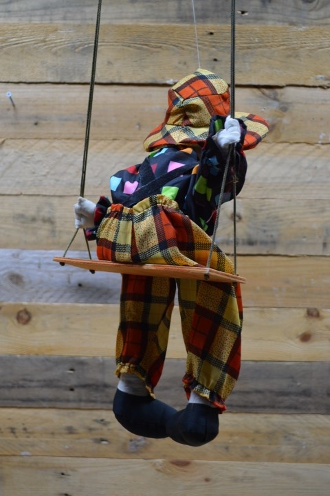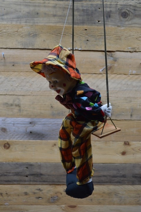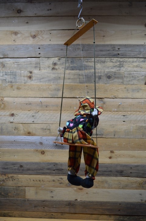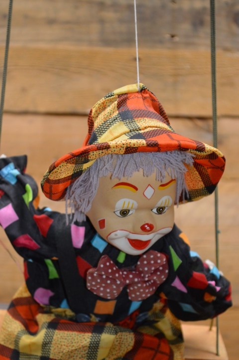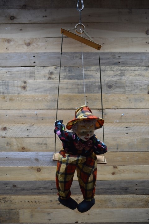 Leuke tweedehandsedecoratieclown met hoedje op een schommel om als decoratie op te hangen in een vrolijke kinderkamer. De gulle lach en vrolijke kleuren van de kleding fleuren de hele kamer op. Omdat hij op een schommel zit beweegt hij zich op elke klein zuchtje wind.