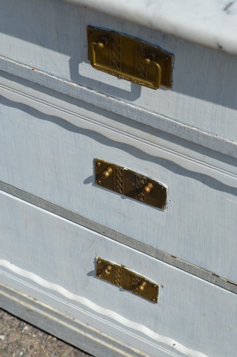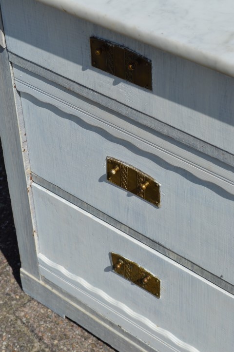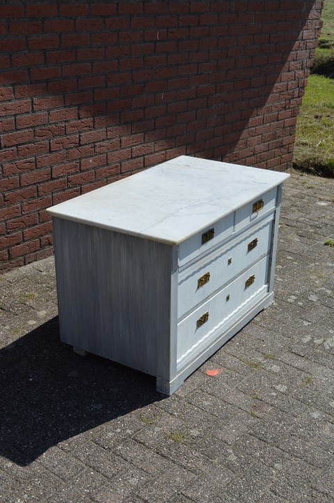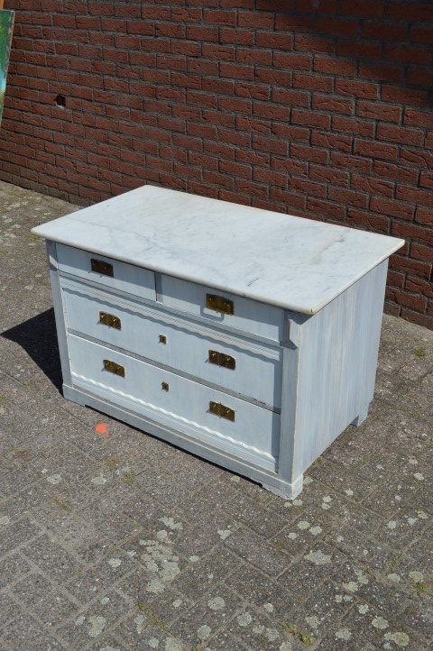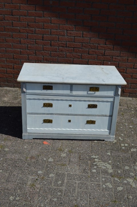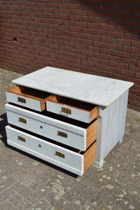 Mooie, ietwat shabby, commode met een marmer blad. Tweedehands massief houten ladekast die wit geschilderd is. De ladekast heeft 2 grote en 2 kleine laden in zeer goede staat voor de leeftijd. Voor een kleinere kast zit er veel bergruimte in.