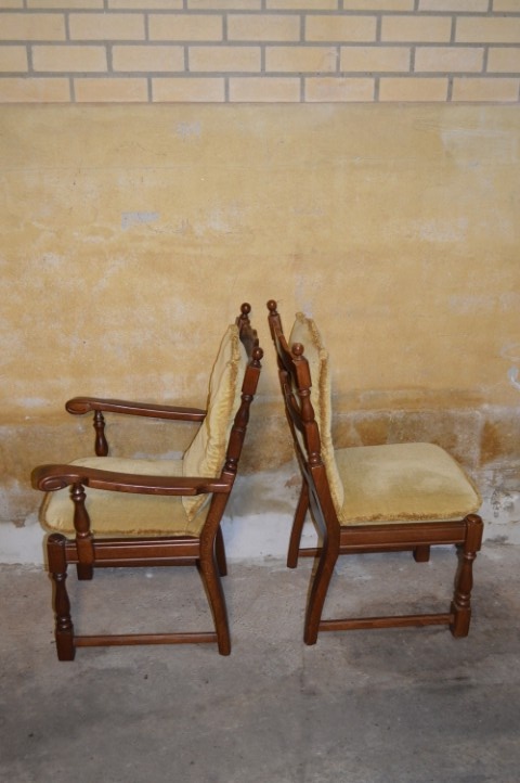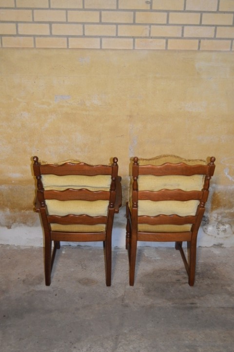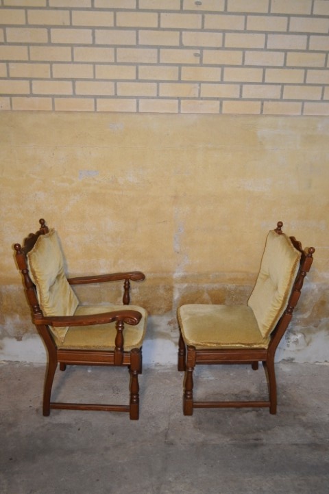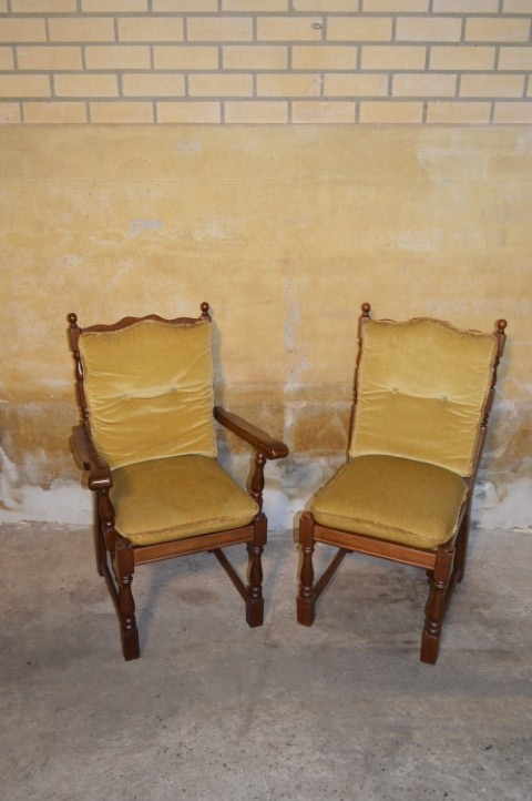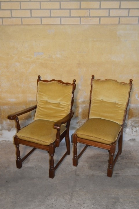 Prachtige set mid century stoelen uit circa 1950, bestaande uit een dames- en een herenstoel. Beide stoelen hebben gele pluche kussens; de herenstoel beschikt over armleuningen, de damesstoel niet. Het houten frame geeft de stoelen stevigheid en karakter, terwijl het shabby chic uiterlijk meteen de aandacht trekt.