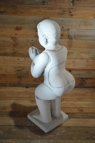 Vrolijk betonnen beeld van een dikke dame in bikini met Rubensiaans postuur. Speels, levenslustig en perfect als blikvanger in tuin, zwembad of woonkamer.
