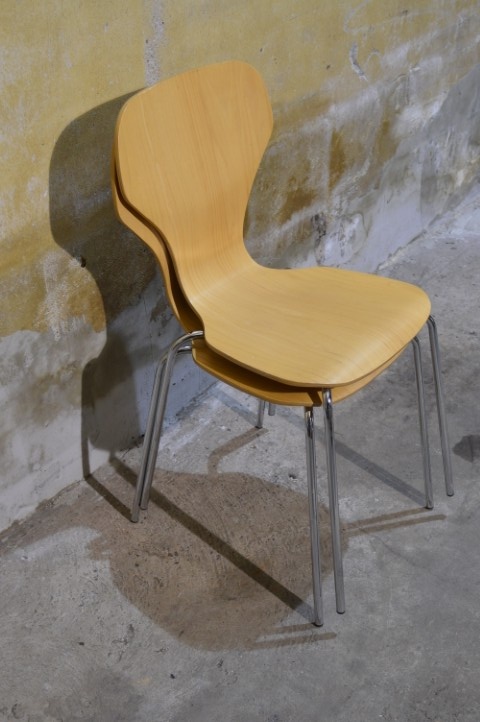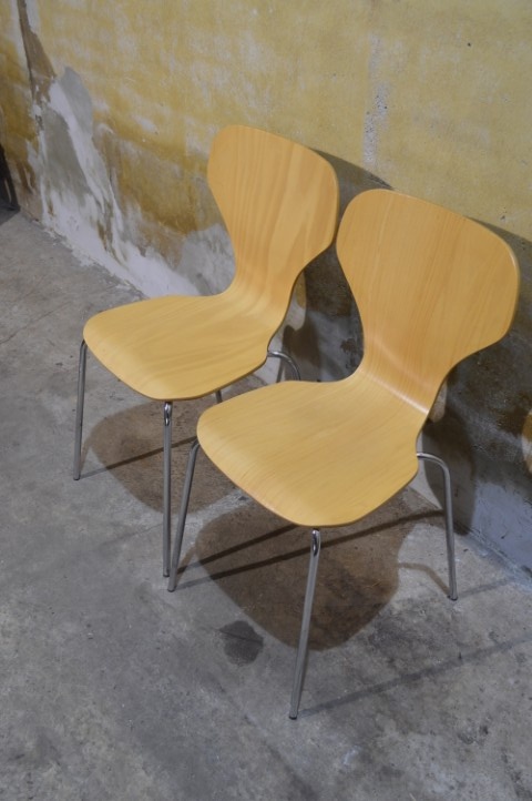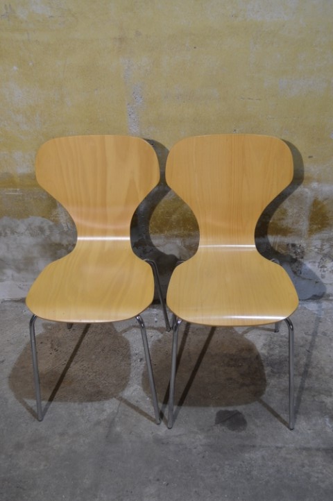 Set van 2 Deense Danerka stoelen uit circa 1980 is een mooi voorbeeld van praktisch en stijlvol Scandinavisch design. De stoelen zijn uitgevoerd in beukenhout en hebben een kenmerkende verbreding in de rugleuning, waardoor ze ook wel vlinderstoelen worden genoemd. Dankzij het slimme ontwerp zijn de stoelen stapelbaar, wat ze ideaal maakt voor flexibel gebruik in de eetkamer of keuken.
