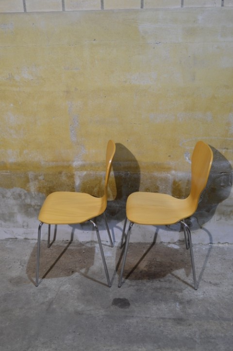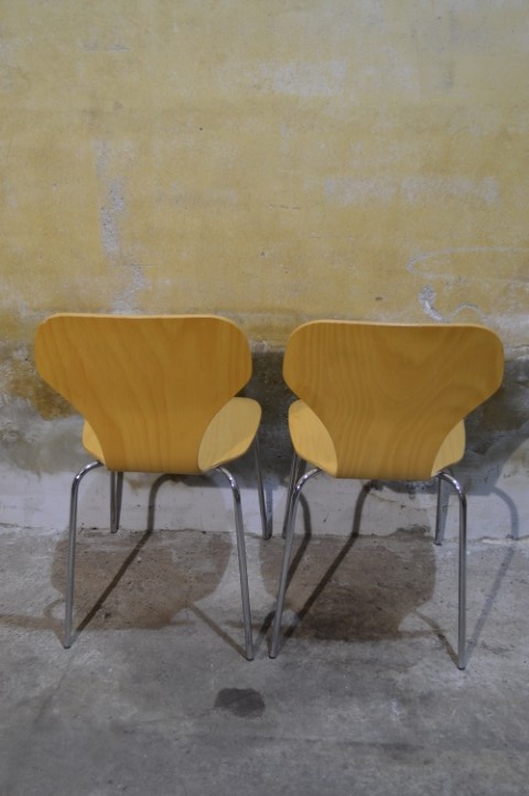 De stoelen hebben gebruikssporen die passen bij de leeftijd en het gebruik, wat bijdraagt aan de authentieke vintage uitstraling.
